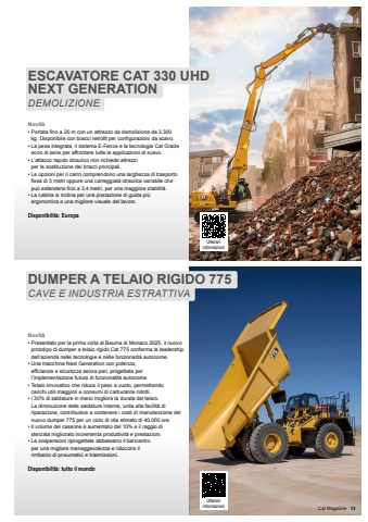 Novit%u00e0%u2022 Presentato per la prima volta al Bauma di Monaco 2025, il nuovo prototipo di dumper a telaio rigido Cat 775 conferma la leadership dell%u2019azienda nelle tecnologie e nelle funzionalit%u00e0 autonome.%u2022 Una macchina Next Generation con potenza, efficienza e sicurezza senza pari, progettata per l%u2019implementazione futura di funzionalit%u00e0 autonome.%u2022 Telaio innovativo che riduce il peso a vuoto, permettendo carichi utili maggiori e consumi di carburante ridotti.%u2022 l 30% di saldature in meno migliora la durata del telaio. La diminuzione delle saldature interne, unita alla facilit%u00e0 di riparazione, contribuisce a contenere i costi di manutenzione del nuovo dumper 775 per un ciclo di vita stimato di 40.000 ore.%u2022 Il volume del cassone %u00e8 aumentato del 10% e il raggio di sterzata migliorato incrementa produttivit%u00e0 e prestazioni.%u2022 Le sospensioni riprogettate abbassano il baricentro per una migliore maneggevolezza e riducono il rimbalzo di pneumatici e trasmissioni.Disponibilit%u00e0: tutto il mondoNovit%u00e0%u2022 Portata fino a 20 m con un attrezzo da demolizione da 3.300 kg. Disponibile con bracci retrofit per configurazioni da scavo.%u2022 La pesa integrata, il sistema E-Fence e la tecnologia Cat Grade sono di serie per affrontare tutte le applicazioni di scavo.%u2022 L%u2019attacco rapido idraulico non richiede attrezzi per la sostituzione dei bracci principali.%u2022 Le opzioni per il carro comprendono una larghezza di trasporto fissa di 3 metri oppure una carreggiata idraulica variabile che pu%u00f2 estendersi fino a 3,4 metri, per una maggiore stabilit%u00e0.%u2022 La cabina si inclina per una postazione di guida pi%u00f9 ergonomica e una migliore visuale del lavoro.Disponibilit%u00e0: EuropaESCAVATORE CAT 330 UHD NEXT GENERATIONDEMOLIZIONEDUMPER A TELAIO RIGIDO 775CAVE E INDUSTRIA ESTRATTIVAUlteriori informazioniUlteriori informazioni Cat Magazine 13