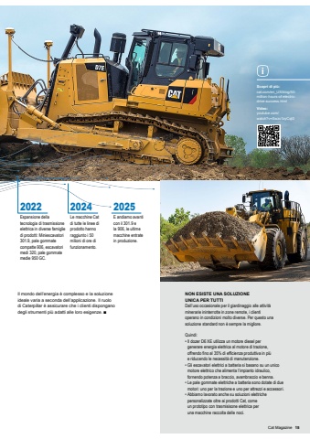 Scopri di pi%u00f9:cat.com/en_US/blog/50-million-hours-of-electricdrive-success.htmlVideo:youtube.com/watch?v=Swzc1zyCqt0Il mondo dell%u2019energia %u00e8 complesso e la soluzione ideale varia a seconda dell%u2019applicazione. Il ruolo di Caterpillar %u00e8 assicurare che i clienti dispongano degli strumenti pi%u00f9 adatti alle loro esigenze. %u25a02025E andiamo avanti con il 301.9 e la 906, le ultime macchine entrate in produzione.NON ESISTE UNA SOLUZIONE UNICA PER TUTTIDall%u2019uso occasionale per il giardinaggio alle attivit%u00e0 minerarie ininterrotte in zone remote, i clienti operano in condizioni molto diverse. Per questo una soluzione standard non %u00e8 sempre la migliore.Quindi:%u2022 Il dozer D6 XE utilizza un motore diesel per generare energia elettrica al motore di trazione, offrendo fino al 35% di efficienza produttiva in pi%u00f9 e riducendo le necessit%u00e0 di manutenzione.%u2022 Gli escavatori elettrici a batteria si basano su un unico motore elettrico che alimenta l%u2019impianto idraulico, fornendo potenza a braccio, avambraccio e benna.%u2022 Le pale gommate elettriche a batteria sono dotate di due motori: uno per la trazione e uno per attrezzi e accessori.%u2022 Abbiamo lavorato anche su soluzioni elettriche personalizzate oltre ai prodotti Cat, come un prototipo con trasmisisone elettrica per una macchine raccolta delle noci.2022Espansione della tecnologia di trasmissione elettrica in diverse famiglie di prodotti: Miniescavatori 301.9, pale gommate compatte 906, escavatori medi 320, pale gommate medie 950 GC. 2024Le macchine Cat di tutte le linee di prodotto hanno raggiunto i 50 milioni di ore di funzionamento.Cat Magazine 15