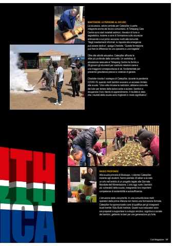 MANTENERE LE PERSONE AL SICUROLa sicurezza, valore centrale per Caterpillar, %u00e8 parte integrante anche del lavoro comunitario. Al Tshepang Care Centre sono stati installati estintori, rilevatori di fumo e segnaletica, insieme a corsi di formazione sulla sicurezza antincendio e sul primo soccorso rivolti alla comunit%u00e0. %u201cNegli insediamenti informali, la risposta alle emergenze pu%u00f2 essere tardiva%u201d, spiega Charlotte. %u201cQuesta formazione pu%u00f2 fare la differenza tra uno spavento e una tragedia%u201d.Oltre alle attivit%u00e0 educative, Caterpillar affronta le sfide pi%u00f9 profonde della comunit%u00e0. Un workshop di educazione sessuale al Tshepang Centre ha fornito a 26 giovani gli strumenti per costruire relazioni sane e una maggiore consapevolezza di s%u00e9, fondamentale per prevenire gravidanze precoci e violenza di genere.Charlotte ricorda il sostegno di Caterpillar, durante la pandemia COVID-19, quando molti bambini avevano un accesso limitato alla scuola: %u201cUna volta rimosse le restrizioni, abbiamo coinvolto dei tutor per tenere delle lezioni extra e aiutare i bambini a recuperare il loro ritardo di apprendimento. Il risultato %u00e8 stato che i risultati della scuola sono migliorati in modo significativo%u201d.RADICI PROFONDEAlla scuola primaria di Moduopo, i volontari Caterpillar, insieme agli studenti, hanno piantato 25 alberi e avviato un orto nell%u2019ambito di un progetto legato alla Giornata Mondiale dell%u2019Alimentazione. L%u2019orto oggi nutre i bambini pi%u00f9 vulnerabili della scuola, insegnando loro importanti competenze di sostenibilit%u00e0 e autosufficienza.L%u2019istruzione resta una priorit%u00e0. In una comunit%u00e0 dove molti operatori della prima infanzia non hanno una formazione formale, Caterpillar ha sponsorizzato corsi di qualifica per gli insegnanti locali tramite l%u2019Edu-Build Institute. Questi nuovi educatori sono ora preparati a supportare lo sviluppo emotivo, cognitivo e sociale dei bambini, gettando le basi per una generazione pi%u00f9 forte.Cat Magazine 17