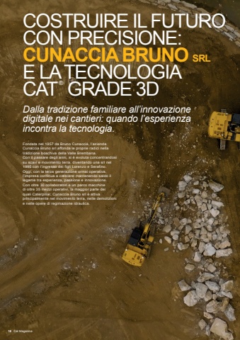 18 Cat MagazineCOSTRUIRE IL FUTURO CON PRECISIONE: CUNACCIA BRUNO SRLE LA TECNOLOGIA CAT %u00ae GRADE 3DFondata nel 1957 da Bruno Cunaccia, l%u2019azienda Cunaccia Bruno srl affonda le proprie radici nella tradizione boschiva della Valle Brembana. Con il passare degli anni, si %u00e8 evoluta concentrandosi su scavi e movimento terra, diventando una srl nel 1995 con l%u2019ingresso dei figli Lorenzo e Serafino. Oggi, con la terza generazione ormai operativa, l%u2019impresa continua a crescere mantenendo saldo il legame tra esperienza, passione e innovazione.Con oltre 30 collaboratori e un parco macchine di oltre 35 mezzi operativi, la maggior parte dei quali Caterpillar, Cunaccia Bruno srl %u00e8 attiva principalmente nel movimento terra, nelle demolizioni e nelle opere di regimazione idraulica.Dalla tradizione familiare all%u2019innovazione digitale nei cantieri: quando l%u2019esperienza incontra la tecnologia.