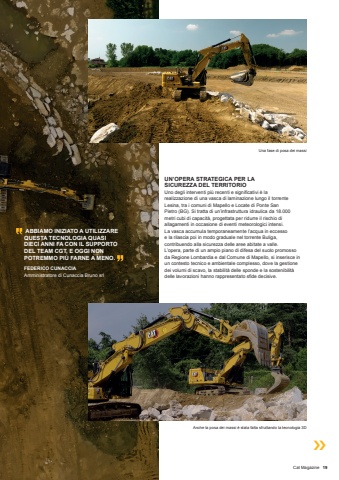 %u203a%u203aAnche la posa dei massi %u00e8 stata fatta sfruttando la tecnologia 3DCat Magazine 19ABBIAMO INIZIATO A UTILIZZARE QUESTA TECNOLOGIA QUASI DIECI ANNI FA CON IL SUPPORTO DEL TEAM CGT, E OGGI NON POTREMMO PI%u00d9 FARNE A MENO.FEDERICO CUNACCIAAmministratore di Cunaccia Bruno srlUN%u2019OPERA STRATEGICA PER LA SICUREZZA DEL TERRITORIO Uno degli interventi pi%u00f9 recenti e significativi %u00e8 la realizzazione di una vasca di laminazione lungo il torrente Lesina, tra i comuni di Mapello e Locate di Ponte San Pietro (BG). Si tratta di un%u2019infrastruttura idraulica da 18.000 metri cubi di capacit%u00e0, progettata per ridurre il rischio di allagamenti in occasione di eventi meteorologici intensi.La vasca accumula temporaneamente l%u2019acqua in eccesso e la rilascia poi in modo graduale nel torrente Buliga, contribuendo alla sicurezza delle aree abitate a valle.L%u2019opera, parte di un ampio piano di difesa del suolo promosso da Regione Lombardia e dal Comune di Mapello, si inserisce in un contesto tecnico e ambientale complesso, dove la gestione dei volumi di scavo, la stabilit%u00e0 delle sponde e la sostenibilit%u00e0 delle lavorazioni hanno rappresentato sfide decisive.Una fase di posa dei massi