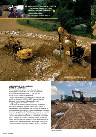 20 Cat Magazine323 e 330 Cat Next Generation hanno movimentato circa 25.000 metri cubi di terraINNOVAZIONE CHE CAMBIA IL MODO DI LAVORARE Per la realizzazione dell%u2019intervento, Cunaccia Bruno srlha impiegato due escavatori Cat%u00ae Next Generation 330 e 323, dotati di tecnologia Grade 3D, oggi presente su ben otto macchine Cat%u00ae dell%u2019azienda.%u201cAbbiamo iniziato a utilizzare questa tecnologia quasi dieci anni fa con il supporto del Team CGT,%u201d racconta Federico Cunaccia, Amministratore di Cunaccia Bruno srl,%u201ce oggi non potremmo pi%u00f9 farne a meno.%u201dLa precisione del sistema consente di lavorare con estrema accuratezza, riducendo al minimo rilavorazioni e sprechi. Il materiale viene movimentato una sola volta, con un risparmio di tempo e carburante fino al 40%. Inoltre, la possibilit%u00e0 di modificare da remoto i progetti tramite Works Manager consente un controllo costante del cantiere e una gestione flessibile delle lavorazioni.Grazie al 3D, non servono picchetti n%u00e9 personale di supporto per scavi e scogliere: la sicurezza aumenta e il lavoro procede con fluidit%u00e0. Anche gli operatori apprezzano molto la tecnologia e con l%u2019ampio monitor possono orientarsi in tempo reale, monitorando l%u2019avanzamento delle attivit%u00e0 con maggiore comfort e precisione.L'argine prende formaSIAMO MOLTO SODDISFATTI DELLA TECNOLOGIA GRADE 3D E DEL RAPPORTO CON IL TEAM CGT.FEDERICO CUNACCIAAmministratore di Cunaccia Bruno srl