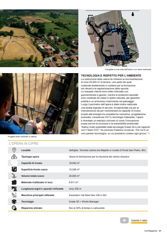TECNOLOGIA E RISPETTO PER L%u2019AMBIENTE La costruzione della vasca ha richiesto la movimentazione di circa 25.000 m%u00b3 di terreno, una parte dei quali riutilizzati direttamente in cantiere per la formazione dei rilevati e la regolarizzazione delle sponde.Le scarpate interne sono state rinforzate con geomembrane e georeti, mentre le protezioni spondali sono costituite da massi in pietra naturale, per garantire solidit%u00e0 e un armonioso inserimento nel paesaggio.Lungo il perimetro dell%u2019opera %u00e8 stata inoltre realizzata una strada arginale di servizio, fondamentale sia per la manutenzione sia per incrementare la capacit%u00e0 di invaso.Grazie alla sinergia tra competenze costruttive, progettazione avanzata, consulenza CGT e tecnologia Caterpillar, l%u2019opera %u00e8 diventata un esempio concreto di come l%u2019innovazione possa servire la sicurezza e la sostenibilit%u00e0 ambientale.%u201cSiamo molto soddisfatti della tecnologia Grade 3D e del rapporto con il Team CGT,%u201d ha concluso Federico Cunaccia. %u201cPer noi %u00e8 un vero partner tecnologico, su cui possiamo contare ogni giorno.%u201d %ue06eGuarda il video Cat Magazine 21Progetto sotto controllo in cabinaL%u2019OPERA IN CIFRELocalit%u00e0 Valtrighe, Torrente Lesina (tra Mapello e Locate di Ponte San Pietro, BG)Tipologia opera Vasca di laminazione per la riduzione del rischio idraulicoCapacit%u00e0 di invaso 18.000 m%u00b3Superficie fondo vasca 15.228 m%u00b2Volume totale scavo 25.005 m%u00b3Materiale riutilizzato in loco 6.811 m%u00b3Lunghezza argini e sponde rinforzate circa 255 mMacchine principali utilizzate Escavatori Cat Next Gen 330 e 323 Tecnologia Grade 3D + Works ManagerRisparmio stimato fino al 40% di tempo e carburanteIl progetto e una vista dell'area in cui viene realizzato