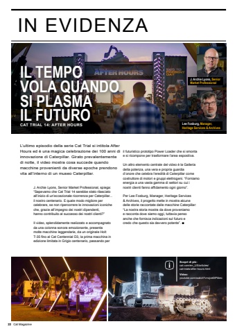 J. Archie Lyons, Senior Market Professional, spiega: %u201cSapevamo che Cat Trial 14 sarebbe stato rilasciato all%u2019inizio di un%u2019eccezionale ricorrenza per Caterpillar... il nostro centenario. E quale modo migliore per celebrare, se non ripercorrere le innovazioni iconiche che, grazie all%u2019impegno dei nostri dipendenti, hanno contribuito al successo dei nostri clienti?%u201dIl video, splendidamente realizzato e accompagnato da una colonna sonora emozionante, presenta molte macchine leggendarie, da un originale Holt T-35 fino al Cat Centennial D3, la prima macchina in edizione limitata in Grigio centenario, passando per il futuristico prototipo Power Loader che si smonta e si ricompone per trasformare l%u2019area espositiva.Un altro elemento centrale del video %u00e8 la Galleria della potenza, una vera e propria guardia d%u2019onore che celebra l%u2019eredit%u00e0 di Caterpillar come costruttore di motori e gruppi elettrogeni. %u201cForniamo energia a una vasta gamma di settori su cui i nostri clienti fanno affidamento ogni giorno%u201d.Per Lee Fosburg, Manager, Heritage Services & Archives, il progetto mette in mostra alcune delle storie raccontate dalle macchine Caterpillar: %u201cLa nostra storia mostra da dove proveniamo e racconta dove siamo oggi, tuttavia penso anche che fornisca indicazioni sul futuro e credo che questo sia davvero potente%u201d. %u25a0IL TEMPO VOLA QUANDO SI PLASMAIL FUTUROL%u2019ultimo episodio della serie Cat Trial si intitola After Hours ed %u00e8 una magica celebrazione dei 100 anni di innovazione di Caterpillar. Girato prevalentemente di notte, il video mostra cosa succede quando macchine provenienti da diverse epoche prendono vita all%u2019interno di un museo Caterpillar.CAT TRIAL 14: AFTER HOURSScopri di pi%u00f9:cat.com/en_US/articles/cat-trials/after-hours.htmlVideo:youtube.com/watch?v=xjve0tPt4ecJ. Archie Lyons, Senior Market ProfessionalLee Fosburg, Manager, Heritage Services & Archives22 Cat MagazineIN EVIDENZA