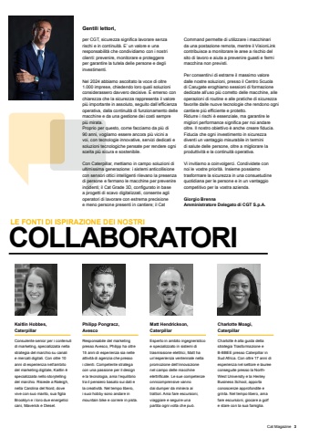 per CGT, sicurezza significa lavorare senza rischi e in continuit%u00e0. E%u2019 un valore e una responsabilit%u00e0 che condividiamo con i nostri clienti: prevenire, monitorare e proteggere per garantire la tutela delle persone e degli investimenti. Nel 2024 abbiamo ascoltato la voce di oltre 1.000 imprese, chiedendo loro quali soluzioni considerassero davvero decisive. %u00c8 emerso con chiarezza che la sicurezza rappresenta il valore pi%u00f9 importante in assoluto, seguito dall%u2019efficienza operativa, dalla continuit%u00e0 di funzionamento delle macchine e da una gestione dei costi sempre pi%u00f9 mirata.Proprio per questo, come facciamo da pi%u00f9 di 90 anni, vogliamo essere ancora pi%u00f9 vicini a voi, con tecnologie innovative, servizi dedicati e soluzioni tecnologiche pensate per rendere ogni scelta pi%u00f9 sicura e sostenibile.Con Caterpillar, mettiamo in campo soluzioni di ultimissima generazione: i sistemi anticollisione con sensori ottici intelligenti rilevano la presenza di persone e fermano le macchine per prevenire incidenti; il Cat Grade 3D, configurato in base a progetti di scavo digitalizzati, consente agli operatori di lavorare con estrema precisione e meno persone presenti in cantiere; il Cat Kaitlin Hobbes, CaterpillarConsulente senior per i contenuti di marketing, specializzata nella strategia del marchio su canali e mercati digitali. Con oltre 10 anni di esperienza nell%u2019ambito del marketing digitale, Kaitlin %u00e8 specializzata nello storytelling del marchio. Risiede a Raleigh, nella Carolina del Nord, dove vive con suo marito, sua figlia Brooklyn e i loro due energetici cani, Maverick e Diesel.Philipp Pongracz, AvescoResponsabile del marketing presso Avesco, Philipp ha oltre 15 anni di esperienza sia nelle attivit%u00e0 di agenzia che presso i clienti. Competente stratega con una passione per il design e la tecnologia, ama l%u2019equilibrio tra il pensiero basato sui dati e la creativit%u00e0. Nel tempo libero, i suoi hobby sono andare in mountain bike e correre in pista.Matt Hendrickson, CaterpillarEsperto in ambito ingegneristico e specializzato in sistemi di trasmissione elettrici, Matt ha un%u2019esperienza ventennale nella promozione dell%u2019innovazione nel campo delle macchine elettrificate. Le sue competenze onnicomprensive vanno dai dumper da miniera ai trattori. Ama fare escursioni, viaggiare e seguire una partita ogni volta che pu%u00f2.Charlotte Moagi, CaterpillarCharlotte %u00e8 alla guida della strategia Trasformazione e B-BBEE presso Caterpillar in Sud Africa. Con oltre 17 anni di esperienza nel settore e lauree conseguite presso la NorthWest University e la Henley Business School, apporta conoscenze approfondite e grinta. Nel tempo libero, ama fare escursioni, giocare a golf e stare con la sua famiglia.LE FONTI DI ISPIRAZIONE DEI NOSTRICOLLABORATORIGentili lettori,Command permette di utilizzare i macchinari da una postazione remota, mentre il VisionLink contribuisce a monitorare le aree a rischio del sito di lavoro e aiuta a prevenire guasti e fermi macchina non previsti.Per consentirvi di estrarre il massimo valore dalle nostre soluzioni, presso il Centro Scuola di Carugate eroghiamo sessioni di formazione dedicate all%u2019uso pi%u00f9 corretto delle macchine, alle operazioni di routine e alle pratiche di sicurezza favorite dalle nuove tecnologie che rendono ogni cantiere pi%u00f9 efficiente e protetto.Ridurre i rischi %u00e8 essenziale, ma garantire le migliori performance significa per noi andare oltre. Il nostro obiettivo %u00e8 anche creare fiducia. Fiducia che ogni investimento in sicurezza diventi un vantaggio misurabile in termini di salute delle persone, oltre a migliorare la produttivit%u00e0 e la continuit%u00e0 operativa.Vi invitiamo a coinvolgerci. Condividete con noi le vostre priorit%u00e0. Insieme possiamo trasformare la sicurezza in una consuetudine quotidiana per le persone e in un vantaggio competitivo per la vostra azienda.Giorgio BrennaAmministratore Delegato di CGT S.p.A.Cat Magazine 3